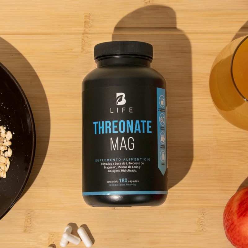 Threonate Mag 180 Cápsulas. Ingredientes Naturales: L Treonato de Magnesio, Melena de Leon y Colágeno Hidrolizado. L Threonate Mag B Life.