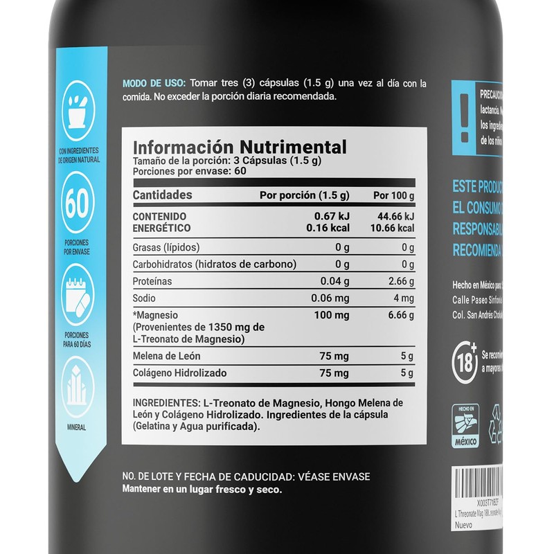 - Thereonate Mag es un suplemento alimenticio con 180 cápsulas a base de L- Treonato de Magnesio (1350 mg), Melena de León y Colágeno Hidrolizado
