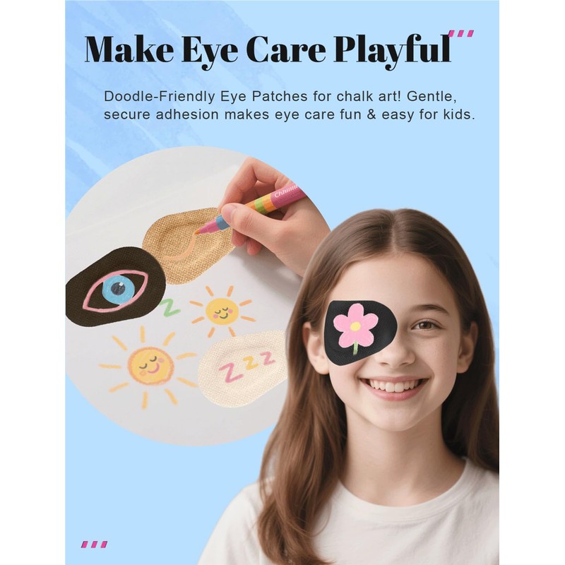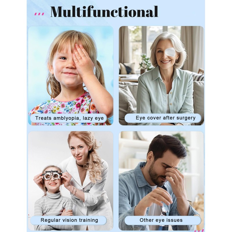 • Suitable for Various Situations: Perfect for treating amblyopia, lazy eye, strabismus. Ideal for after surgery use to keep the eye protected and keep light out. Useful for conditions like Bell's Palsy to keep the eye covered, especially during sleep. Also helpful for those with eye problems like dry eye or when an eye needs to be taped. Can be used during eye therapy as they stay in place effectively. and can be used under glasses.