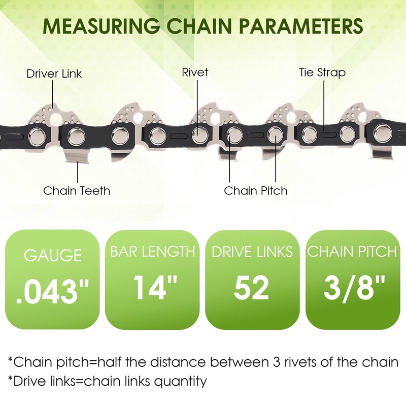 - 14 inch bar length, 3/8 inch pitch, .043 inch gauge, 52 drive links fit for 14 inch chainsaw. Please check your chainsaw or original chains before purchasing, make sure this chainsaw chains is the correct