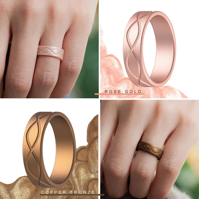 ThunderFit Silicone Wedding Bands for Women, Infinity Design 6mm Wide 1.8mm Thick - 1/4/7 Variety Multipack (Bronze, Rose Gold, Silver, White - Size 9.5-10 (19.8mm))