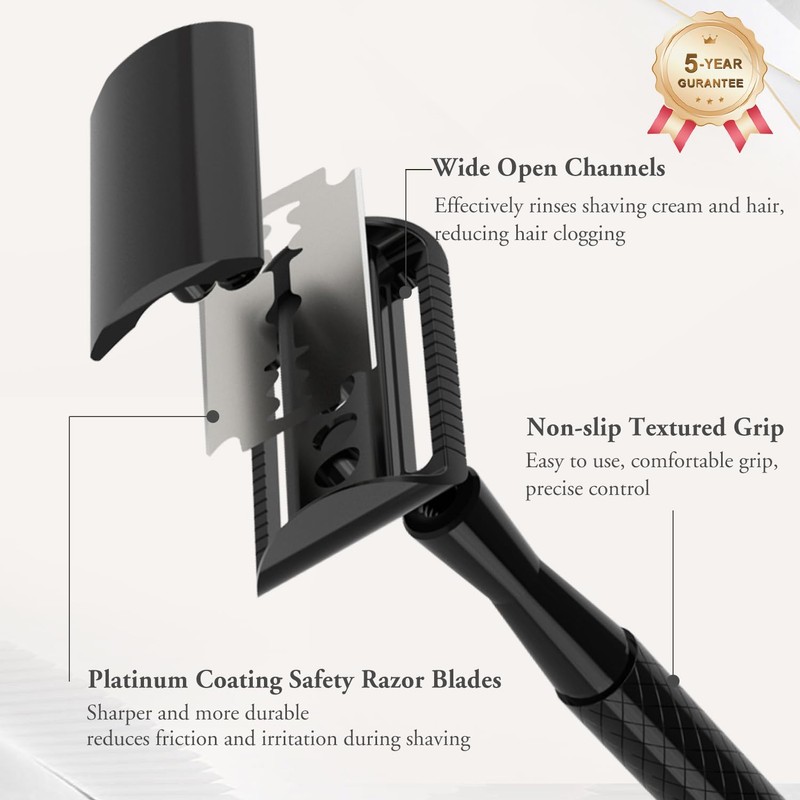 • WHAT'S INCLUDED: Our safety razor kit includes 1 metal safety razor, 5 platinum coated stainless steel blades and 1 user's shaving guide manual. The shaving guide provides instructions for achieving a great shave, please read it carefully