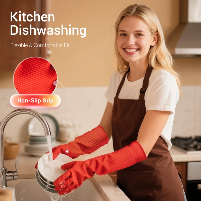 - Enhanced grip: With granules on the palms and fingers, our rubber dish-cleaning gloves offer a reliable anti-slip grip when handling dishes, reducing the risk of dropping or breaking them