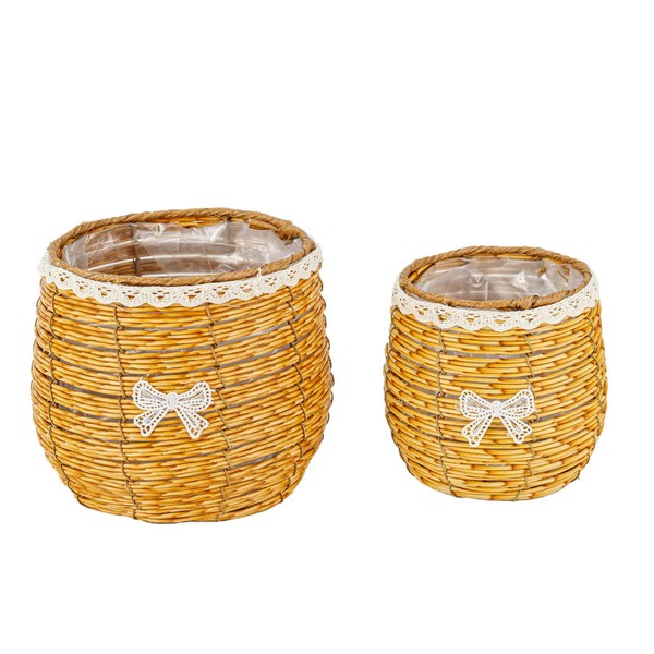 THY COLLECTIBLES Set of 2 Woven Wicker Planter Baskets with Plastic Lining and Bow Accent, Multipurpose Storage for Plants Indoor or Outdoor, Flowers, Toys Rustic Farmhouse Containers (Natural)