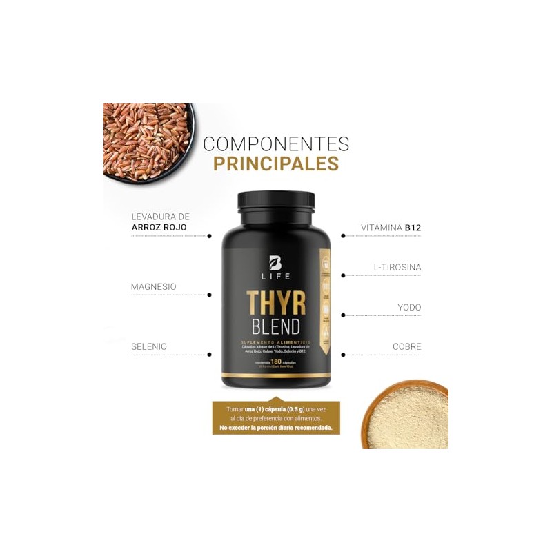 Thyr Blend 180 Cpsulas. Ingredientes naturales L-Tirosina, Cobre, Selenio, Yodo, Levadura de Arroz Rojo y B12. Thyro Blend B Life.
