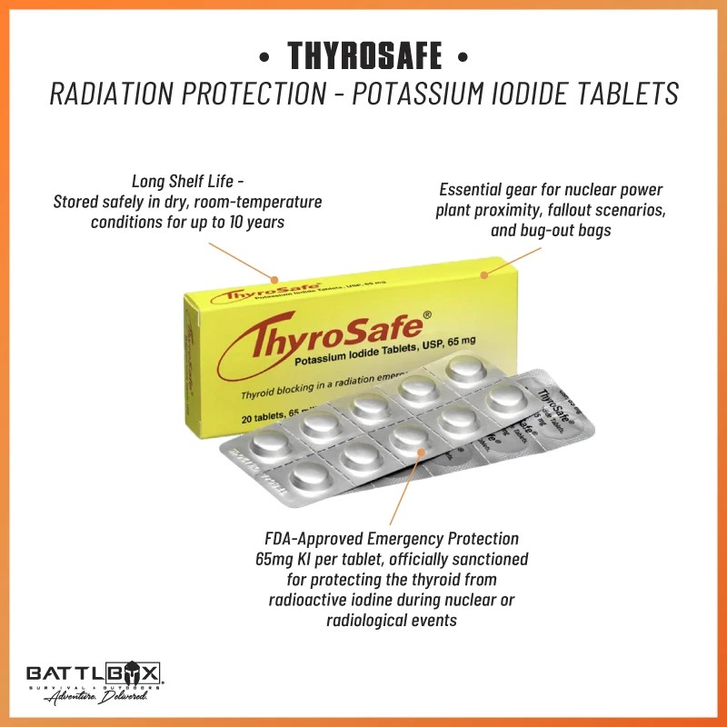 Prepare for the unexpected with ThyroSafe® 65mg Potassium Iodide (KI) Tablets, an essential addition to any emergency prep kit. Designed to help protect your thyroid from radioactive iodine in the event of a nuclear or radiological incident, ThyroSafe is FDA-approved and trusted by emergency management agencies and preppers nationwide.