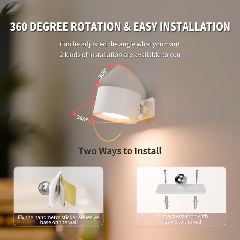 • 【360 DEGREE ROTATION & EASY INSTALLATION】This bedside lamp comes with magnetic ball which can be mounted by adhesive tapes and screws (all included). Can be adjusted the angle what you want,2 kinds of installation are available to you. And this wireless wall lights feature 360 ° rotation magnetic ball for light exactly where you need it (size: 3.15 x 2.99 x 1.81 in).