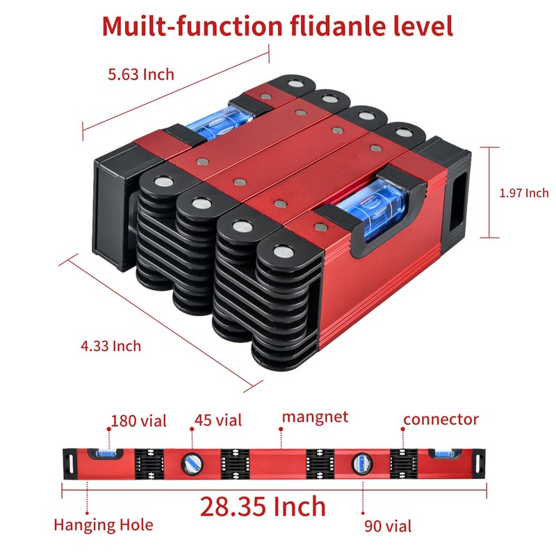 28-Inch Foldable Level Tool. 5 sections foldable level can be folded or extended freely to help you freely adjust when measuring. It is designed for construction, cabinet installation, laying flooring, home furnishing, decorating, woodworking, home repair, hanging household and other construction projects.