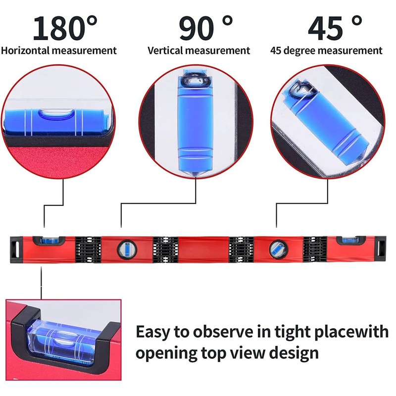 • 【📐Craftsman Level】This nivel flexible measuring tool is used to detect the level and verticality of objects. It is suitable for measuring work in home, engineering, construction, decoration, carpentry and other fields, which can meet your various measuring needs. Place the level tool directly on the surface of the object, and determine whether the object is at an angle of 180°, 90° or 45° to the ground by observing whether the leveling bubble stays in the middle of the liquid.