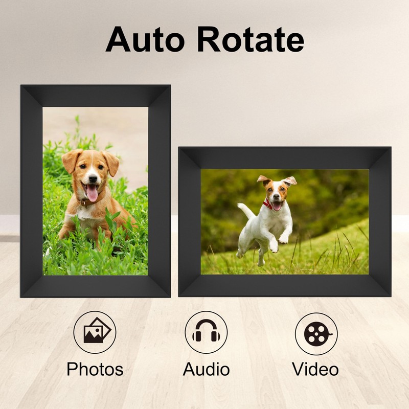 - Practical and thoughtful design: the digital picture frame has an automatic rotation function that automatically rotates photos and adjusts the alignment so that the frame fits ambidextrous. The digital picture frame also has multifunctional custom settings such as automatic playback, image zoom, hide/publish image, labeling, adjustable brightness, sleep mode, etc. It can be placed on a table for a clear view.