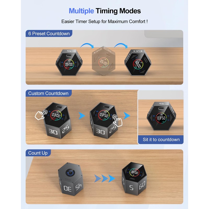 - Two time modes. The cube timer offers countdown and count-up modes. Apart from the 6 preset countdowns and custom countdowns, you can start count-up mode by turning the timer upside down and stopping it by setting up the screen. The timer range is 00:01 to 99:59. Easy timer setup for maximum convenience.