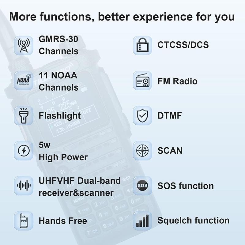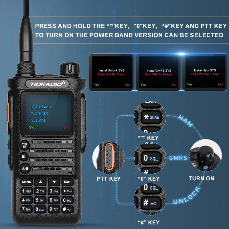 - Version Switch:The new technology implemented in this incredible TD-H8 for version switching between Ham, GMRS and Unlocked. The feature is highly recognized and appreciated by the radio community. : 144-148 420-450 : 462.55000-467.72500 : 136-174 400-520 (Note:If don’t know how to switch the version, please contact us)