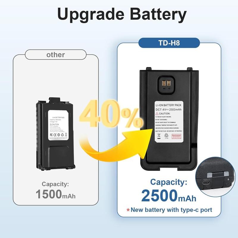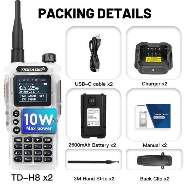 - Package Detail: 2 X TD-H8 (Ham/GMRS) Radio Handheld/ 2 X 2500mAh Battery/ 2 X USB-C Charger and cable/ 2 X Belt Clip/2 X User Manual/ 2 X Lanyard