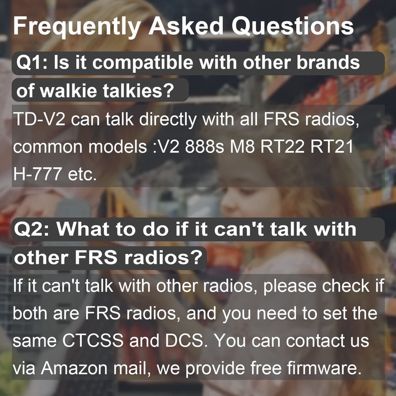 • Multi functions✔ VOX; CTCSS&DCS private codes make your communication with encryption; scanning allows you locate conversations in progress; They also work well with other models after programming.