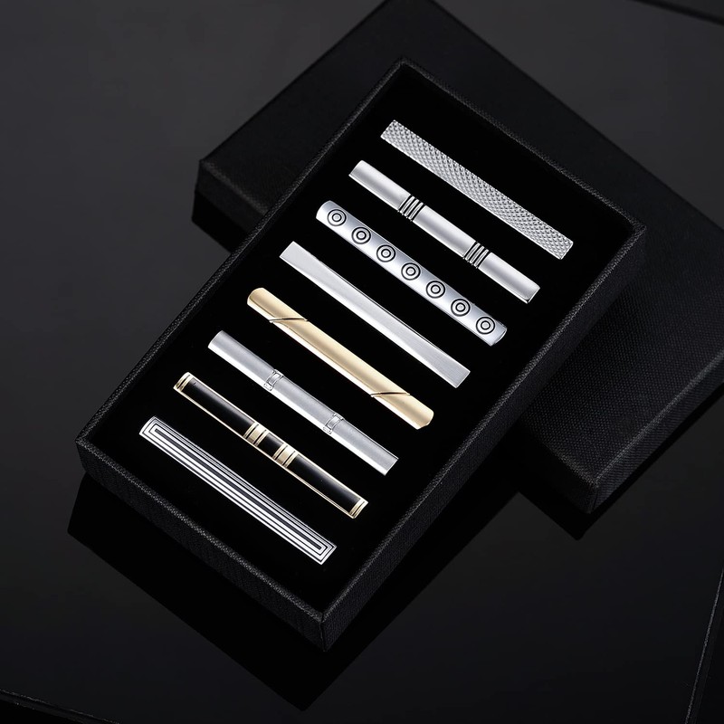 Tie Clips for Men, 8 Pcs Tie Bars Pinch Clip Set Silver Black 2.3 Inches Business Shirt Necktie Parts T0308001