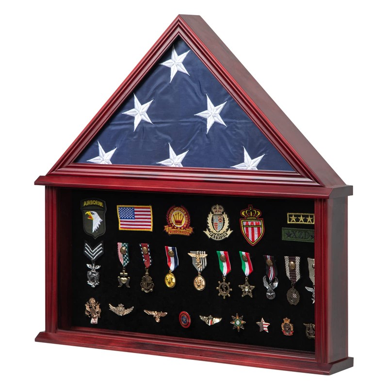 - TOP QUALITY MATERIALS - The burial flag display case are made of solid wood, with a mahogany finish and High Definition Thick Real Glass front. Protect your flag, certificate document and badges from dust, moisture and scratches, make them great for years. Comes with a document holder to protect your valued certificates and personalized documents.