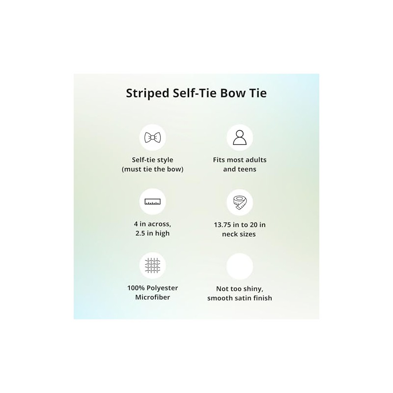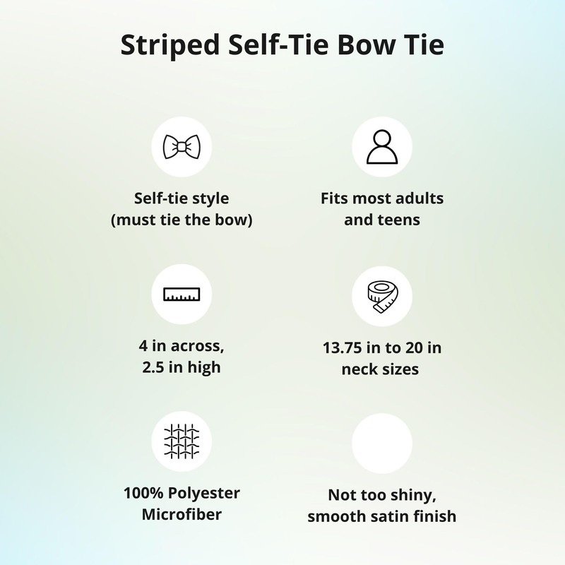 Make a statement in a fun and colorful striped bow tie. Self-tie style. The bow measures 4-inches across and 2.5-inches tall when tied, and the adjustable neck fits sizes from 13.75- to 18-inches.