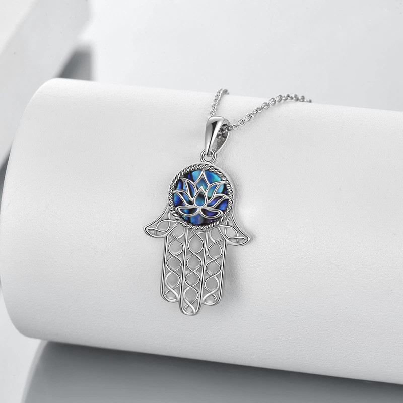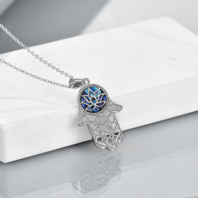TIGER RIDER Hamsa Hand Necklace 925 Sterling Silver Abalone Shell with Lotus Necklace for Women, Good Luck Amulet Jewelry for Women