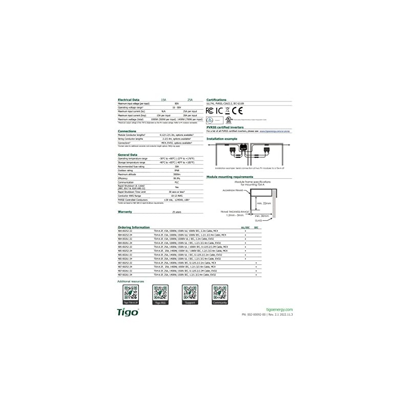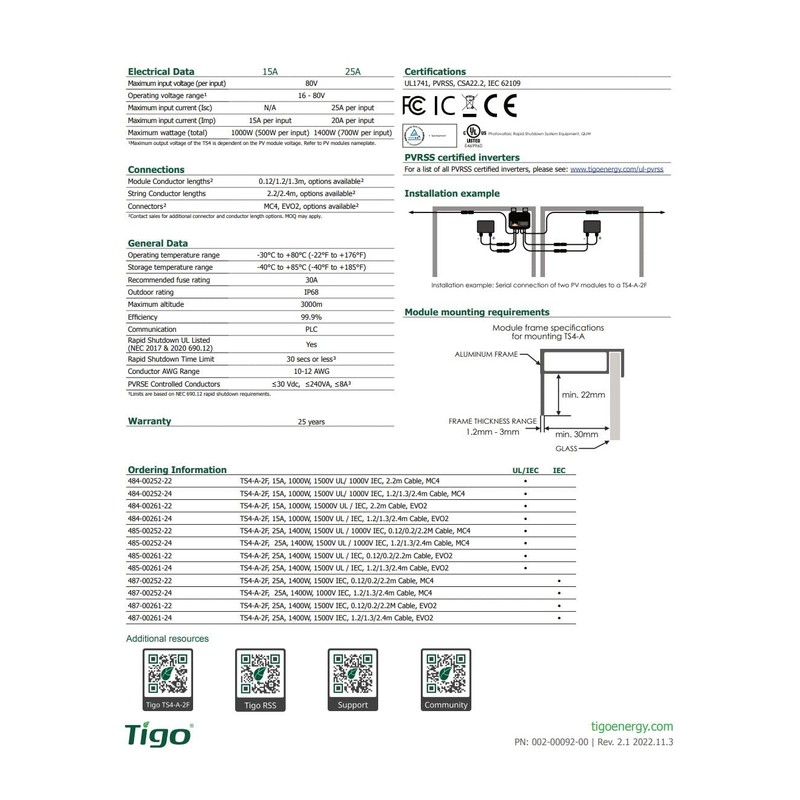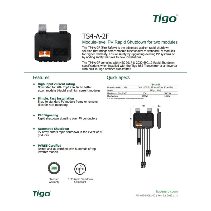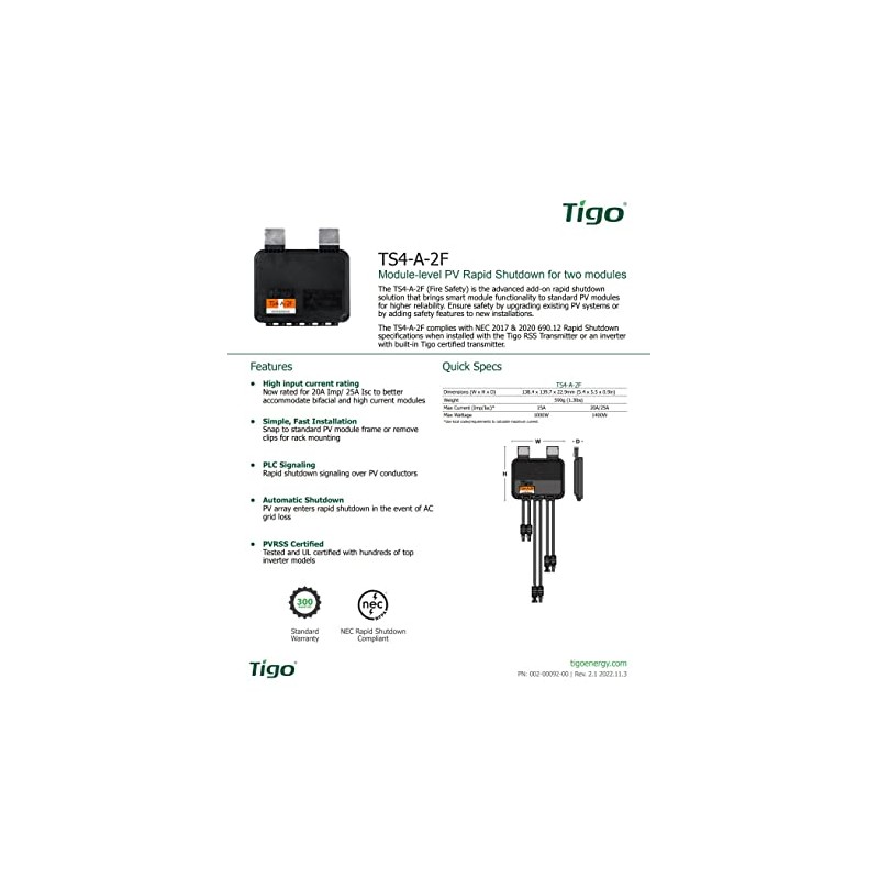 Tigo TS4-A-2F PV Module-level Rapid Shutdown for Two Modules The Tigo TS4-A-2F is a reliable, cost effective rapid shutdown solution that meets the latest module level shutdown requirements, including NEC 2017/2020. The TS4-A-2F is both IEC and UL certified for global acceptance. It is UL PVRSS certified for connectivity with the largest network of inverters, many of which have a built in RSS transmitter. By connecting to two modules, the TS4-A-2F reduces labor time and enables 16 percent fewer connections on a 14 panel string compared to single channel MLPE. Functions Rapid Shutdown Configuration 2 modules per TS4 Required RSS Transmitter