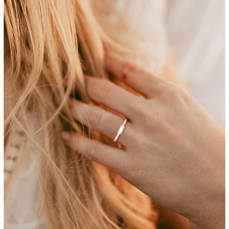 - Specification: 5A baguette cut 2.5*5mm center stone, has a classic 4 prong set craft to prevent the stone fall off. Total 18pcs 1.2mm small round cubic zirconia pave inlay