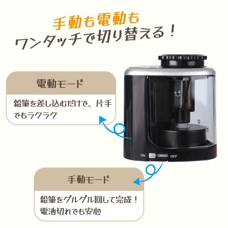 - Cordless and can be used anywhere: This pencil sharpener is light enough to be used with 2 AA batteries (not included). It can be used not only on the table of the living room or a study desk in the kids room, but also in the classroom, library, or anywhere you like. It can also be moved by hand with 2 ways, so you can easily switch between it with a single touch. When using manual mode, you can rest assured if you cannot replace it immediately. Compact size makes it easy to carry, and it can be used for storing skimas
