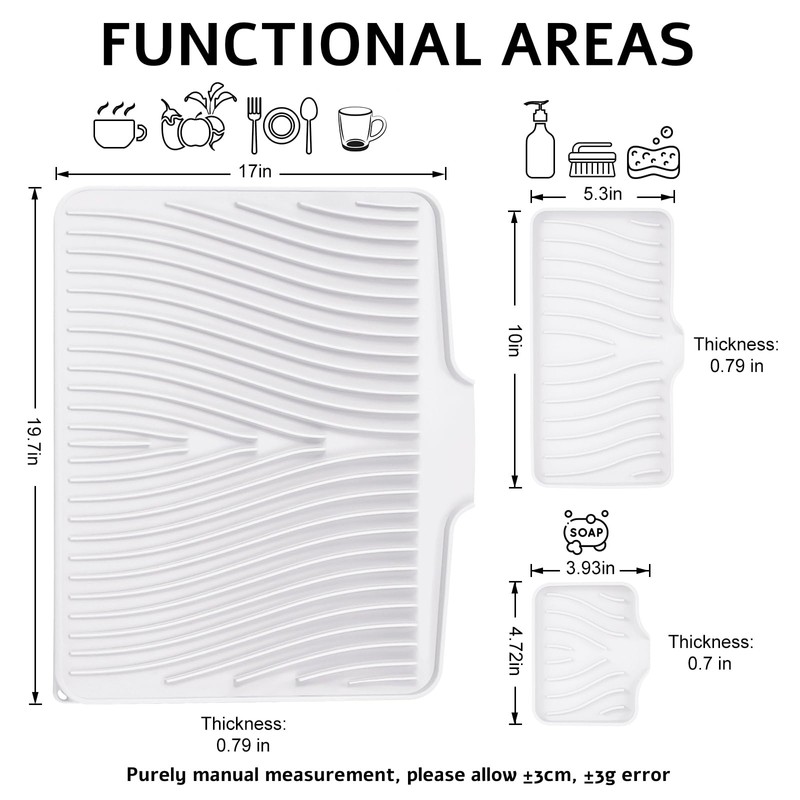 - Quick Dry Mat: The TIKNIK dish drying mat comes in 3 sizes, including a larger design up to 19.7" x 17", for washing dishes to air dry. The quick dry dish mat's foldable design and innovative design allow air to circulate under the dishes, and features unique diagonal ridges to easily remove moisture, and a specially designed edge that allows water to drain directly into the sink. This keeps your countertops dry and clean, and says goodbye to the trouble of wet countertops.