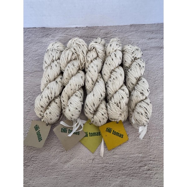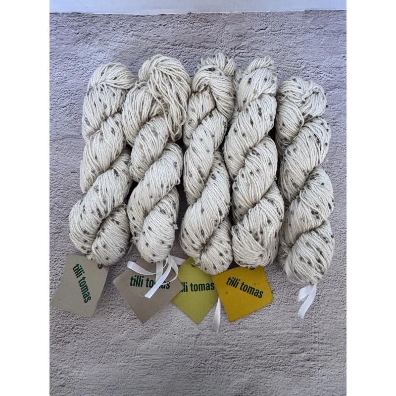 The Tilli Tomas Beaded Plié Yarn is a luxurious and unique crafting material made of 100% silk with glass beads woven throughout. This white yarn comes in a skein of 120 yards per 100 grams and is perfect for a variety of projects such as crochet, baby items, accessories, and more. The hand-dyed yarn adds a touch of elegance to any project, making it a versatile and eye-catching choice for your next crafting endeavor.