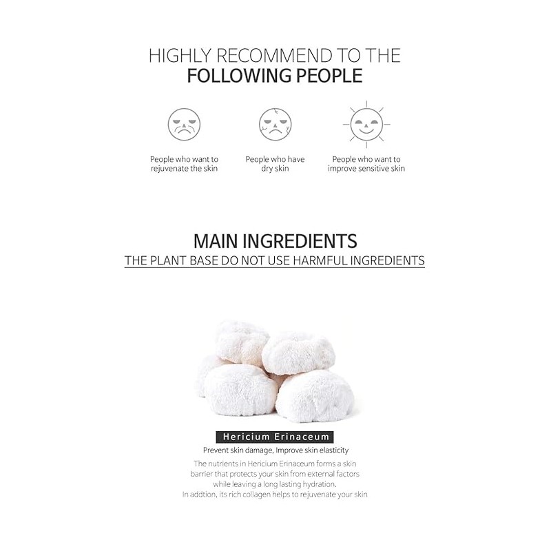 - Lightweight mushroom collagen effortlessly absorbs into your skin and reduces the appearance of wrinkles / Tremella Fuciformis allows the skin to retain more water and helps prevent the aging of micro-blood vessels