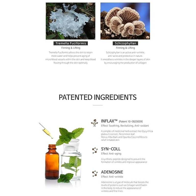 - Rich mushroom ingredients and SYN-COLL blended in golden ratio to intensely smoother and firmer skin / Syn-coll is a synthetic peptide designed to prevent the formation of wrinkles and improve the appearance / Schizophyllum Mushroom encourages the production of collagen and smoothens wrinkles from the deeper layers of skin