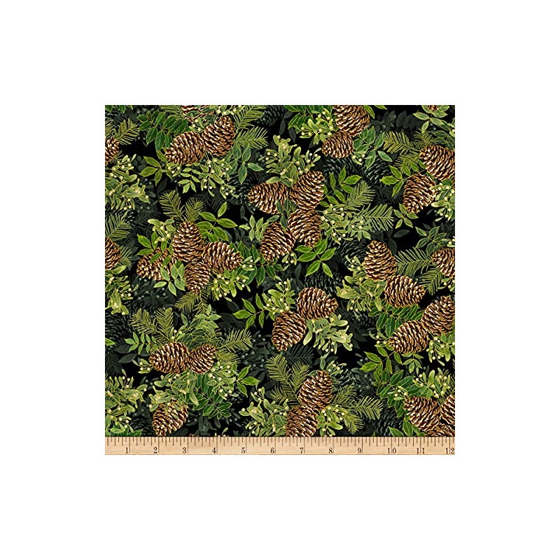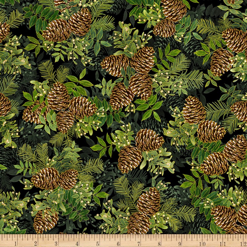 Timeless Treasures Metallic Holiday Spice Small Pinecone Bouquets Black, Quilting Fabric by the Yard