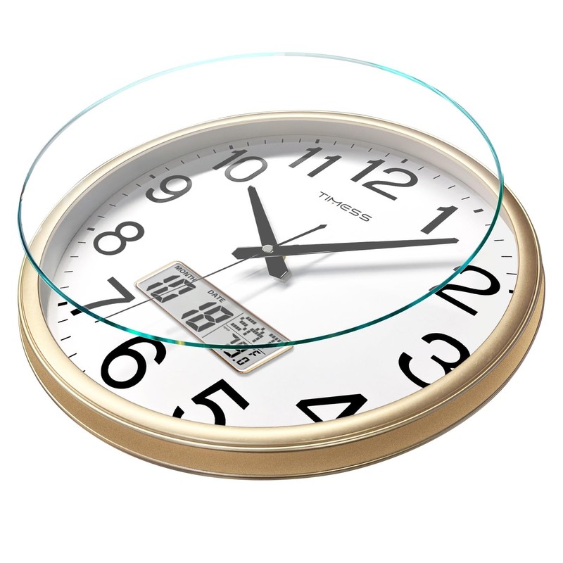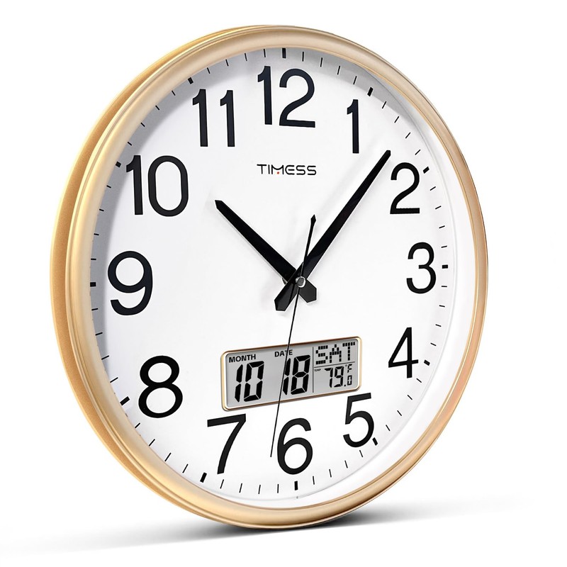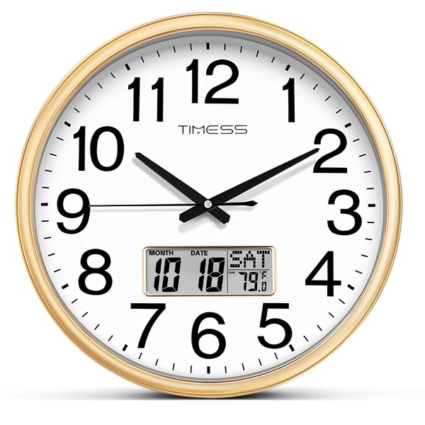 TIMESS Wall Clock, 16 Inch Non-Ticking Silent Battery Operated Quartz Analog with LCD Display for Perpetual Calendar and F° Temperature, Ideal Modern Home, Bedroom, Kitchen, Office Décor (Gold)