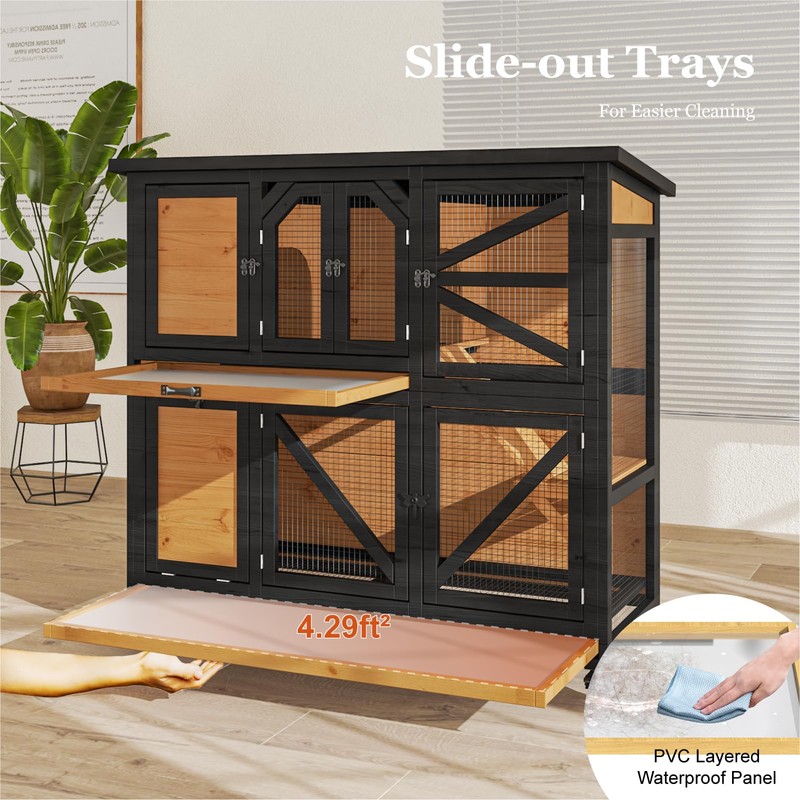 TIMHAKA 2 Story Rabbit Cage with Run, 47.3" Indoor & Outdoor Rabbit Hutch, Bunny Cage for Guinea Pig, Wooden Design with 2 Removable Tray, Waterproof Roof & 4 Metal Wheels for Small-Medium Animals