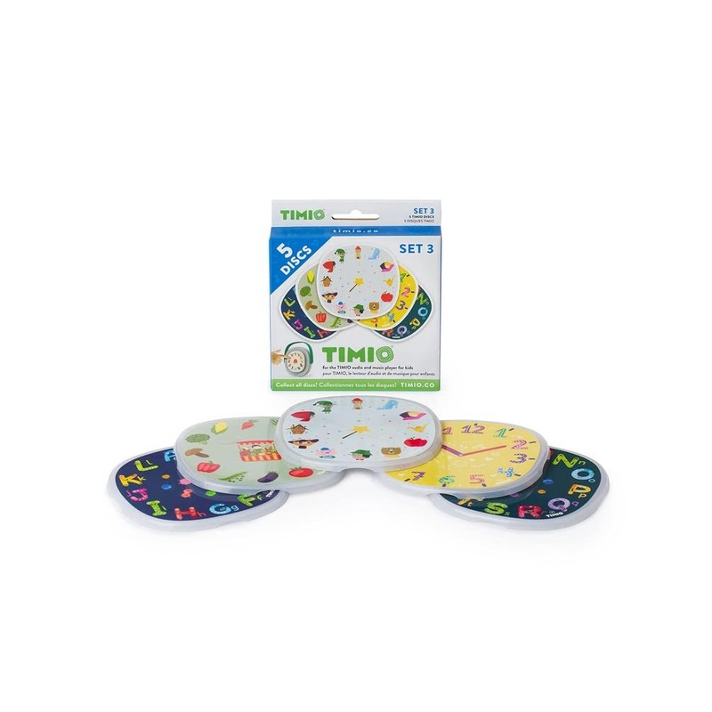 5 Disc Expansion Kit for TIMIO: Fairy Tales Vol. I, The time, The vegetables, The alphabet A-L, The alphabet M-Z 5 disc expansion kit for TIMIO, the educational audio and music player for children With TIMIO you have fun without a screen. Nursery rhymes, lullabies, fairy tales and vocabulary, he has everything to have fun and to learn. Want a little more variety beyond the 5 discs supplied as standard? We offer 4 additional sets of discs. In this way, you can develop your child's education and entertainment. Learn languages ​​while playing. This music and sound player can be set to French, English, Spanish, German, Chinese (Mandarin), Dutch, Italian and Portuguese (Br); All the included discs are therefore playable in 8 languages.