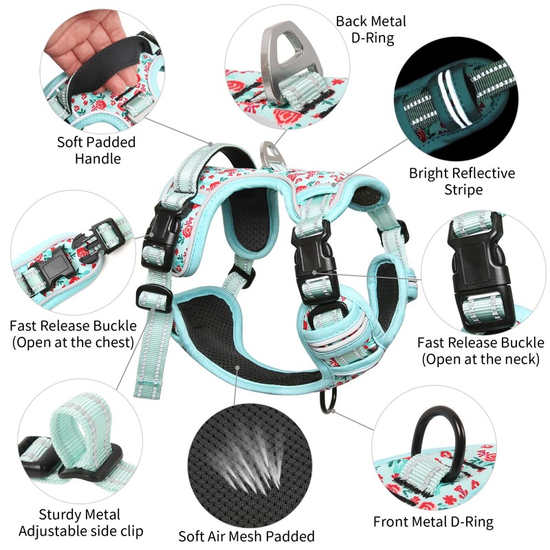 - 【4 WAYS ADJUSTABLE STRAPS】The fit of this pet harness can be completely customized for your pet using the slide adjusters at the chest and neck.You can use its 2 neck straps and 2 chest straps to create a Perfect Fit for your dog with some room of growth. No worries about slipping out or choking.