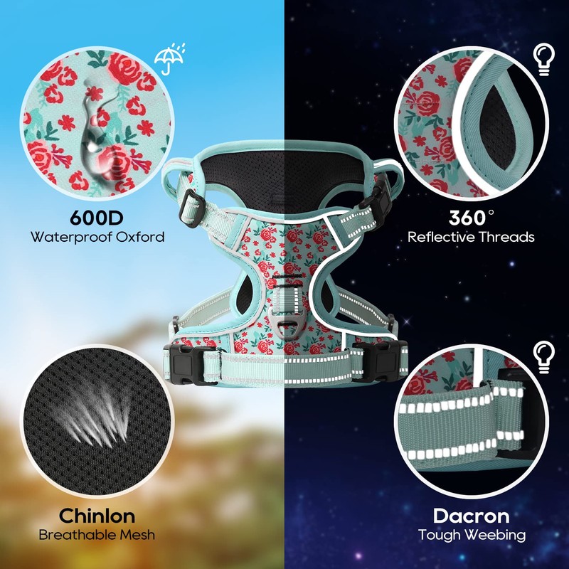 - 【MUCH SAFER & MORE COMFORTABLE】 Breathable mesh lining with soft sponge padding plate of puppy harness prevents injuries, giving extra comfort and protection with enhanced 1680D oxford fabric. The reflective material will be really nice when it gets dark. Also, your dog will be saw easily. This reflective material can make drivers have long time to react, which ensure your dog’s safety!