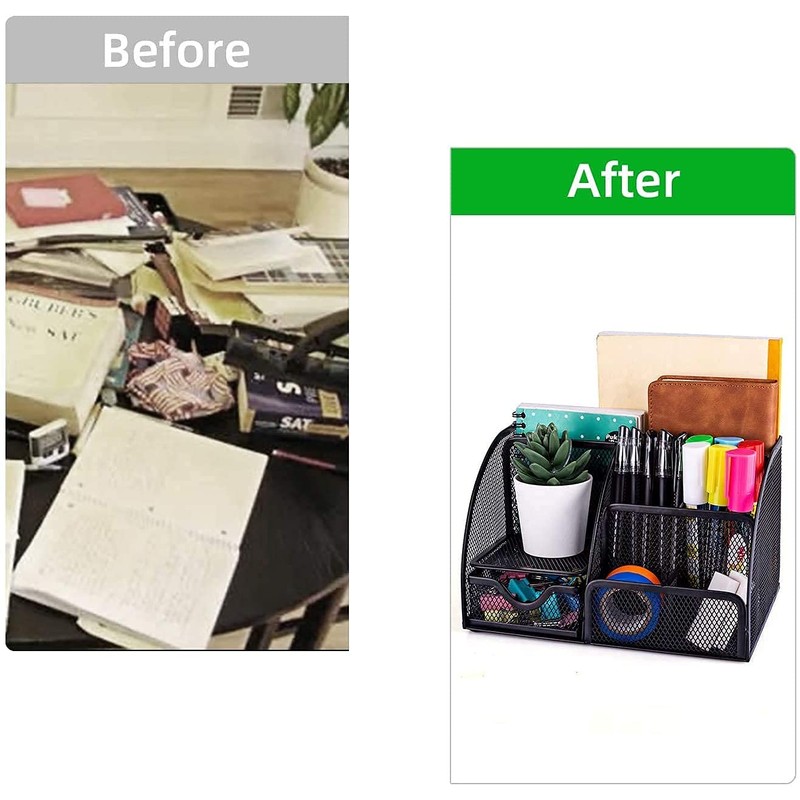 - ¡Ahorra espacio! Gracias a sus compartimentos diseñados para blocks de notas, libretas, lapiceras y artículos pequeños como cinta o clips, tu escritorio estará siempre limpio y organizado para que tengas todo a la mano y seas más eficiente en el día a día.