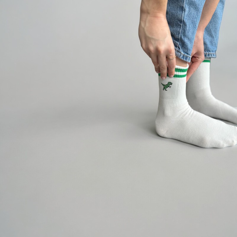 - Funny dino design: these white socks are printed with a cute dino motif that adds a playful and unique touch to any outfit.