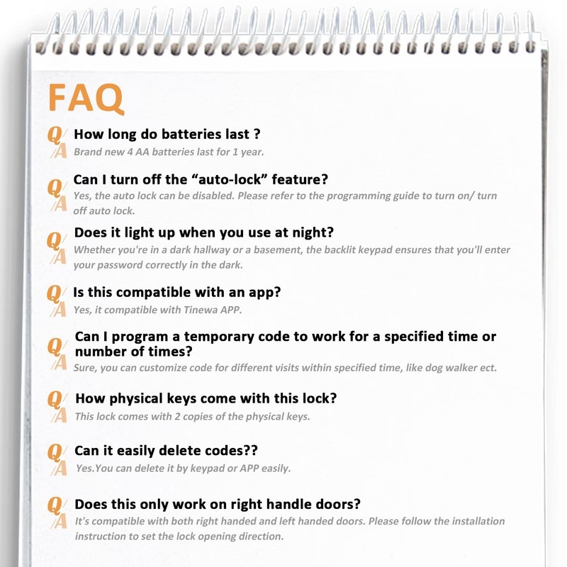 • [Tinewa Always at Your Service]: Tinewa Smart Team provides excellent customer service to our smart door lock. 30-day free return guarantee, 1-year product warranty and a lifetime customer support following the date of purchase. If you have any problems during installation and use, please feel free to contact us.