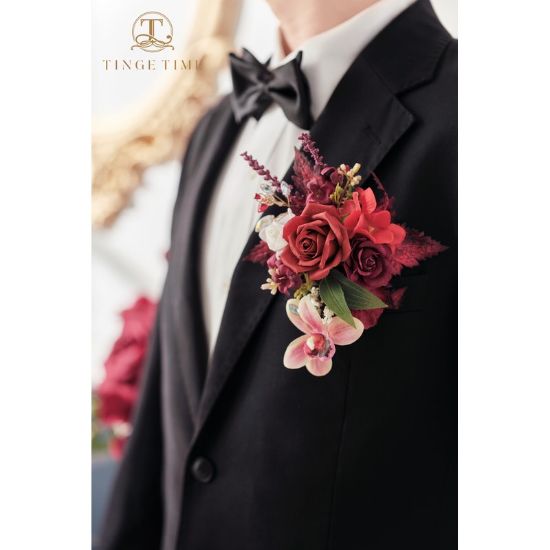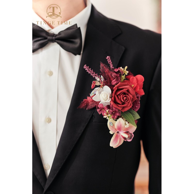 - 【Material】 The boutonniere is made of silk flowers that are hard to distinguish from real ones, artificial flowers and green plants, and are decorated with some exquisite accessories.