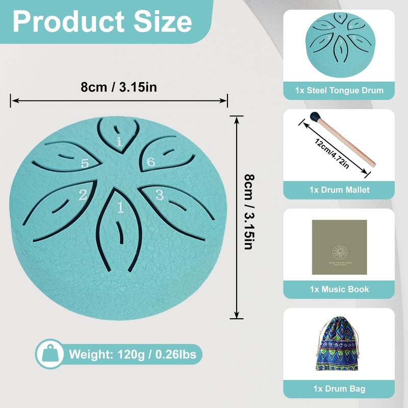 - Mini Tongue Drum:Designed with a mini pocket size, this 3 inch mini rain drum is very portable. Its small size as musical instruments on the go, allows you to create beautiful melodies whenever and wherever you want