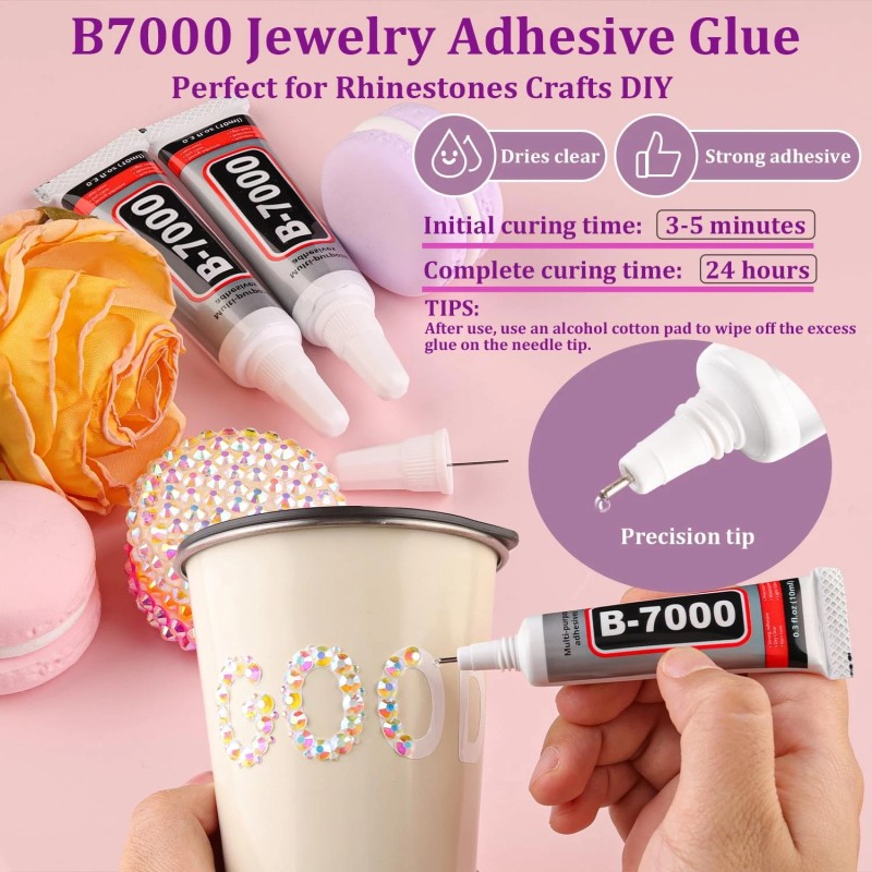 💎B7000 CLEAR GLUE FOR GEMS -- Our B7000 glue has strong adhesion and dries clear, non-toxic and harmless to the skin.The glue has a precision needle for easy application, initial cure time is 3-5 minutes and full cure time is 24 hours. The glue will have a slight overflow when first used, before use you can leave the glue head up for a few minutes to avoid overflow. After use, the needle needs to be wiped with an alcohol pad.