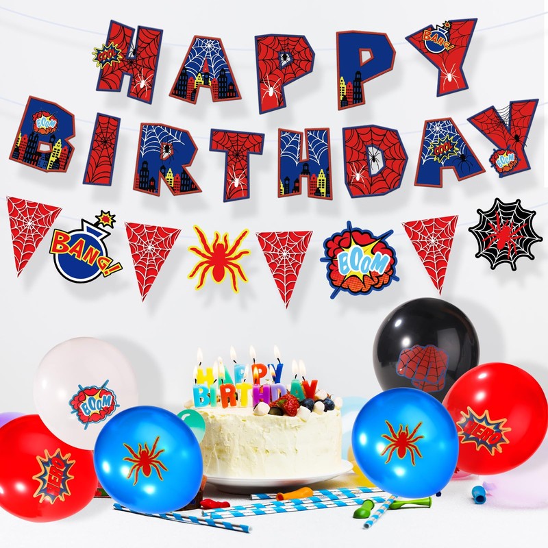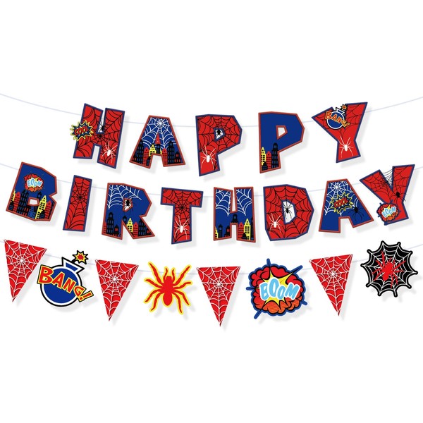 Tinoaly Spider-Themed Birthday Party Decorations Set, Includes Happy Birthday Banner & Spiderweb Pennant Flag Sign Garland for Kids Backdrop Party Supplies for Boys Girls Baby Shower Decor