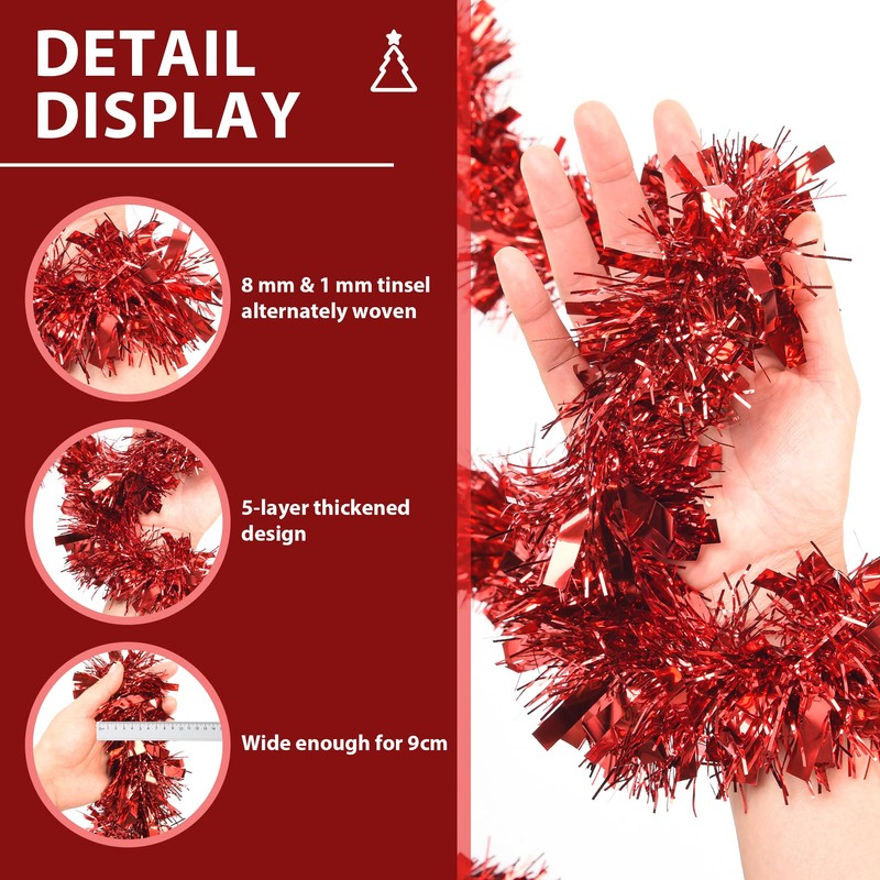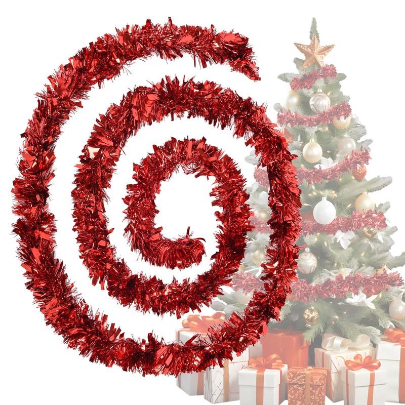 - Perfect Christmas tree decoration red: ideal as a decoration for Christmas, winter, New Year's Eve, birthday leisure and much more. Or hang these garlands to place them around Christmas tree, doors, stairs, trees, windows, handrails or the fireplace. Beautify your Christmas with this beautiful Christmas tinsel