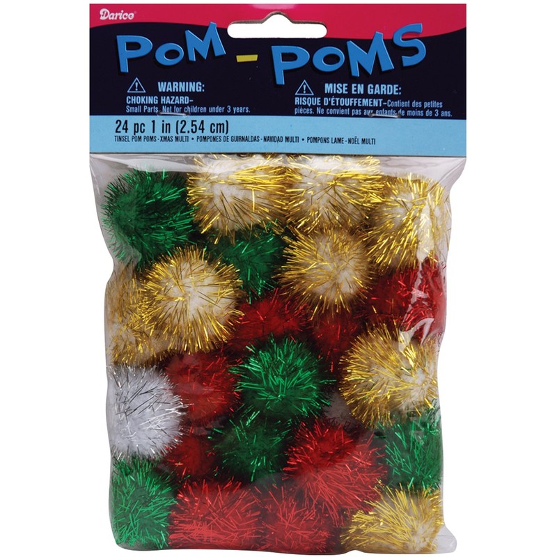 Tinsel Pom Poms. These acrylic pom poms are perfect for all kinds of crafts for children of all ages. Pom poms have been around for years and are a proven favorite for crafts at home, school, camp, and just about anywhere else. This package contains twenty-four 1" pom poms in a variety of colors. WARNING: Choking Hazard-small parts. Not for children under 3 years.