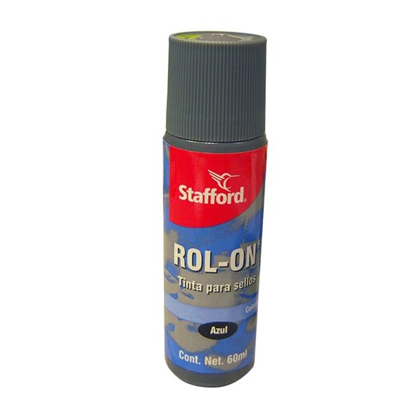 TINTA PARA SELLO ROLL ON AZUL ENVASE ROLL-ON 60 ML STAFFORD. TINTA BASE AGUA QUE AYUDA A IMPRIMIR SELLOS BRILLANTES, NÍTIDOS Y DE RÁPIDO SECADO, EL ENVASE ES TIPO ROLL-ON QUE EVITA DERRAMES DE LA TINTA.