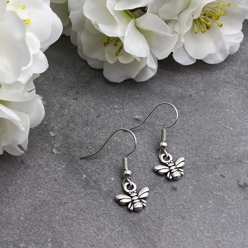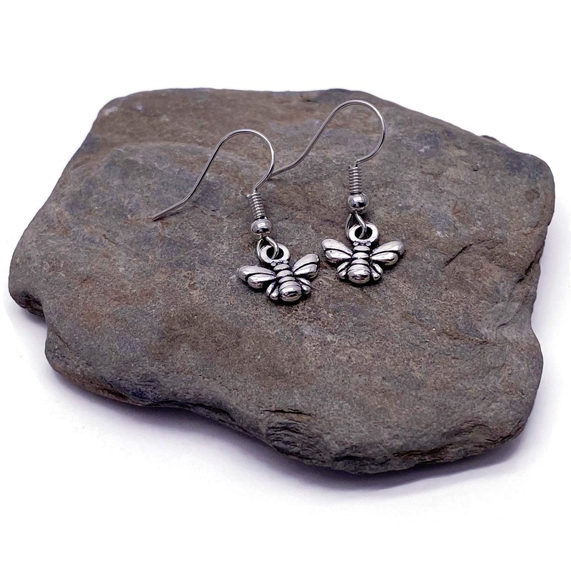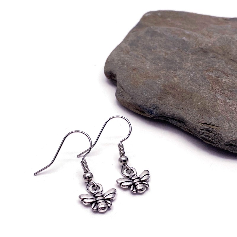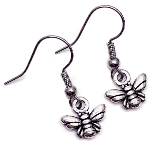 Tiny Bumble Bee Charm Earrings - Cute Tibetan Silver Charms on Nickel Free Hooks : 25mm