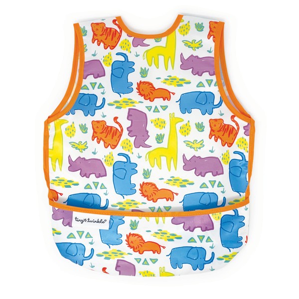 Tiny Twinkle Mess Proof Baby Bib - Waterproof Baby Apron - Machine Washable - PVC, BPA & Phthalate Free - Great Travel Bib for Baby Eating - Baby Food Bibs (Bright Safari, Small 6-24 Months), safari
