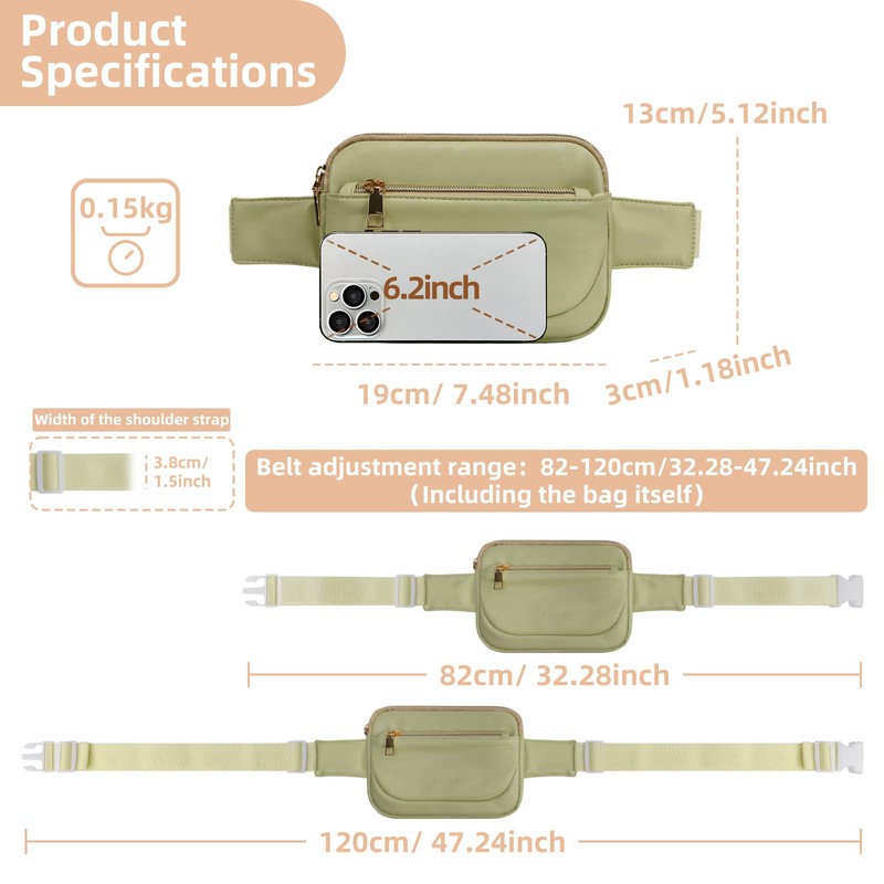 - 【Practical Space】Women waist pack is 7.8x1.5x5.7inch(20x3.5x14.5cm),weight is: 0.3lbs(0.15kg).The fanny pack has 2 zippered main pocket,a front zippered pocket and a zippered inside pocket. It provides enough space to store mobile phones, money, keys, earphones, sunglasses, lipstick and small personal items. If you don't take a lot of things with you when you go out, this is a good choice.