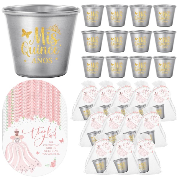 Tioncy 25 Sets Quinceanera Party Favors for Guests Quinceanera Short Glass Stainless Steel Shot Glass Thank You Card Organza Bag Mis Quince Anos Quinceanera Recuerdos Sweet 15 Birthday Party Favor
