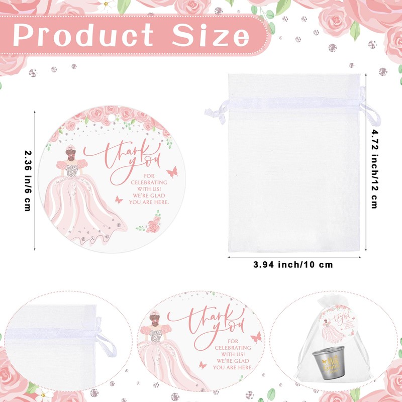 - Ideal Material: our shot glass is made of stainless steel to ensure rust resistance; The thank you quinceanera cards are made of premium 250g coated paper that won't tear easily; The Organza Bags are made from soft yet durable organza fabric, providing a beautiful and practical way to present the shot glass and cards; These materials are carefully choice to ensure the quality for your quinceanera party favors